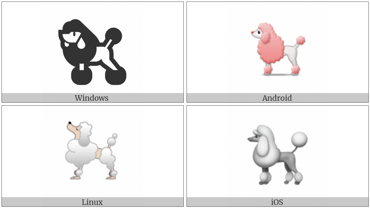 The image below shows how the “Poodle” symbol might look like on different operating systems. If the font in which this web site is displayed does not contain the symbol and there is no fallback font able to render it, you can use the image below to get an idea of what it should look like.