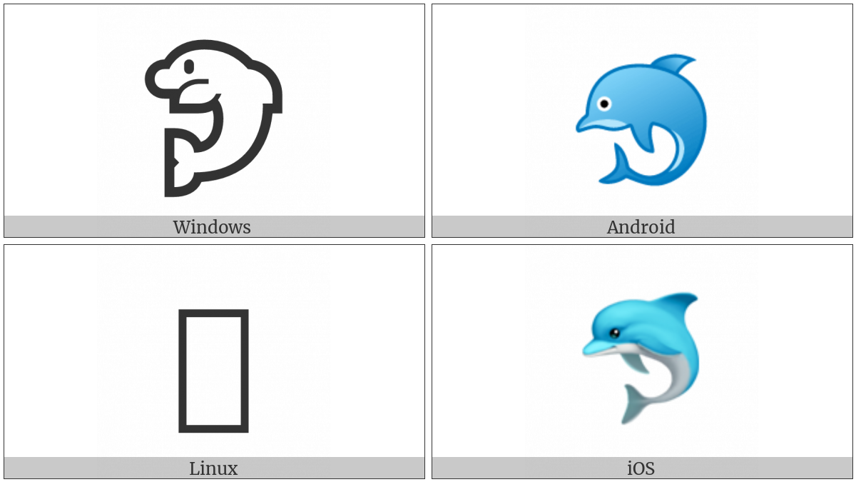 The image below shows how the “Dolphin” symbol might look like on different operating systems. If the font in which this web site is displayed does not contain the symbol and there is no fallback font able to render it, you can use the image below to get an idea of what it should look like.