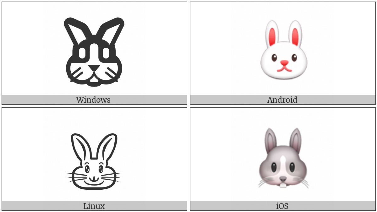 The image below shows how the “Rabbit Face” symbol might look like on different operating systems. If the font in which this web site is displayed does not contain the symbol and there is no fallback font able to render it, you can use the image below to get an idea of what it should look like.