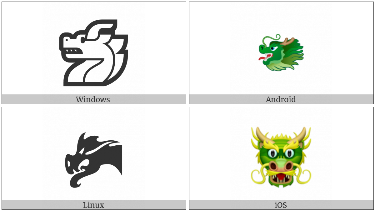 The image below shows how the “Dragon Face” symbol might look like on different operating systems. If the font in which this web site is displayed does not contain the symbol and there is no fallback font able to render it, you can use the image below to get an idea of what it should look like.