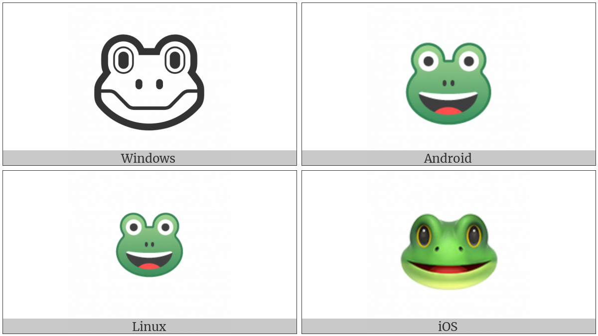 The image below shows how the “Frog Face” symbol might look like on different operating systems. If the font in which this web site is displayed does not contain the symbol and there is no fallback font able to render it, you can use the image below to get an idea of what it should look like.