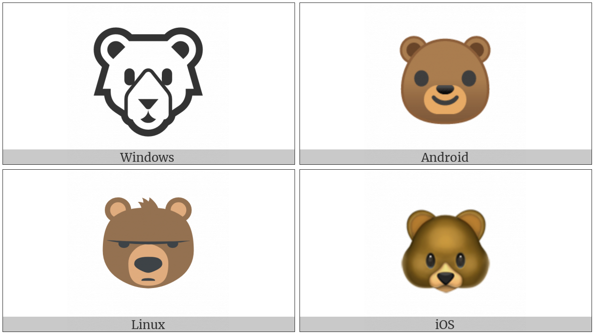 The image below shows how the “Bear Face” symbol might look like on different operating systems. If the font in which this web site is displayed does not contain the symbol and there is no fallback font able to render it, you can use the image below to get an idea of what it should look like.