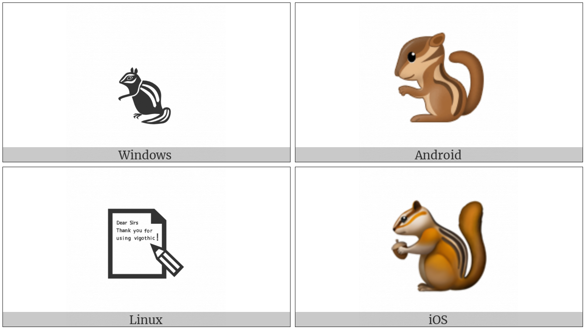 The image below shows how the “Chipmunk” symbol might look like on different operating systems. If the font in which this web site is displayed does not contain the symbol and there is no fallback font able to render it, you can use the image below to get an idea of what it should look like.