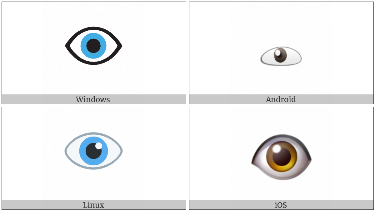 The image below shows how the “Eye” symbol might look like on different operating systems. If the font in which this web site is displayed does not contain the symbol and there is no fallback font able to render it, you can use the image below to get an idea of what it should look like.