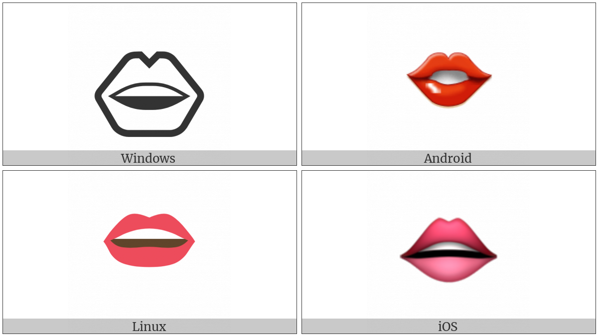 The image below shows how the “Mouth” symbol might look like on different operating systems. If the font in which this web site is displayed does not contain the symbol and there is no fallback font able to render it, you can use the image below to get an idea of what it should look like.