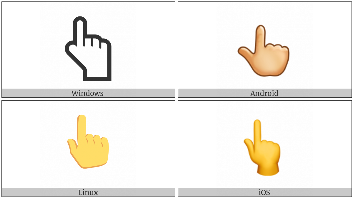 The image below shows how the “White Up Pointing Backhand Index” symbol might look like on different operating systems. If the font in which this web site is displayed does not contain the symbol and there is no fallback font able to render it, you can use the image below to get an idea of what it should look like.
