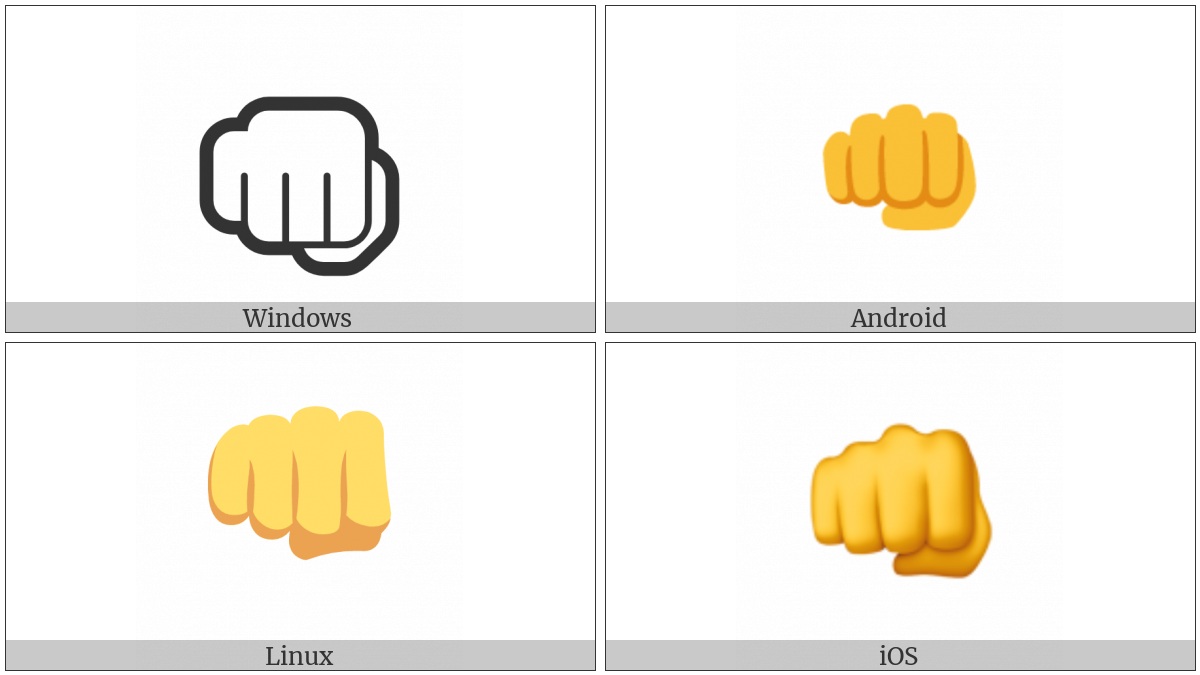 The image below shows how the “Fisted Hand Sign” symbol might look like on different operating systems. If the font in which this web site is displayed does not contain the symbol and there is no fallback font able to render it, you can use the image below to get an idea of what it should look like.