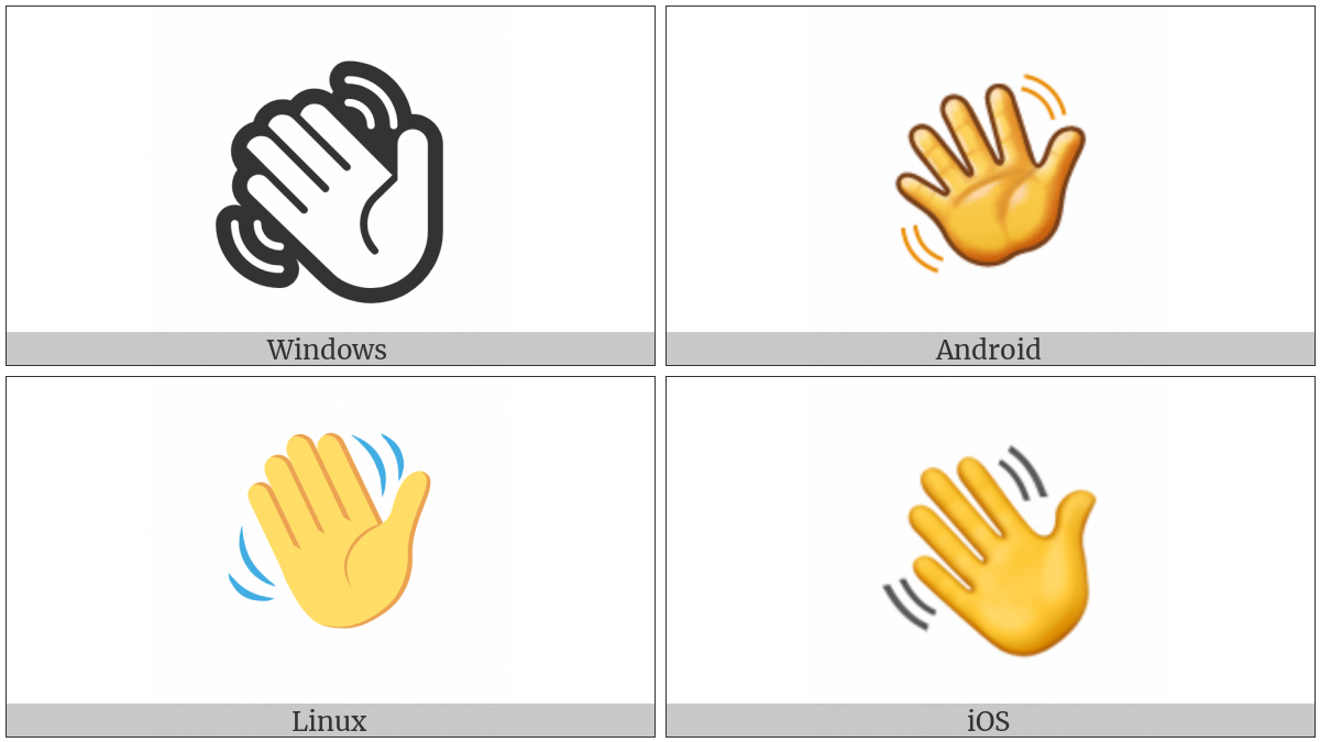 The image below shows how the “Waving Hand Sign” symbol might look like on different operating systems. If the font in which this web site is displayed does not contain the symbol and there is no fallback font able to render it, you can use the image below to get an idea of what it should look like.