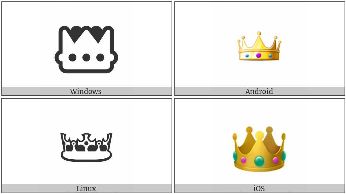 The image below shows how the “Crown” symbol might look like on different operating systems. If the font in which this web site is displayed does not contain the symbol and there is no fallback font able to render it, you can use the image below to get an idea of what it should look like.
