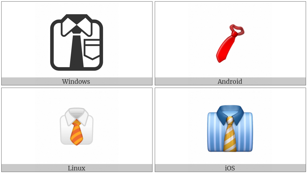 The image below shows how the “Necktie” symbol might look like on different operating systems. If the font in which this web site is displayed does not contain the symbol and there is no fallback font able to render it, you can use the image below to get an idea of what it should look like.