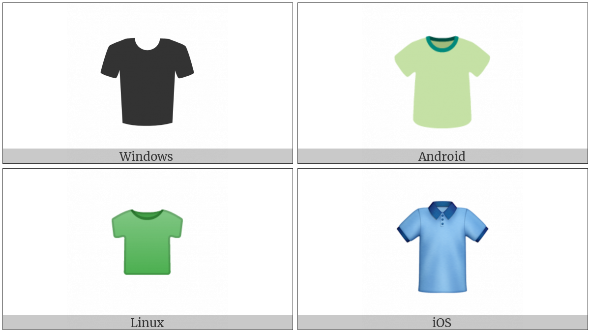 The image below shows how the “T-Shirt” symbol might look like on different operating systems. If the font in which this web site is displayed does not contain the symbol and there is no fallback font able to render it, you can use the image below to get an idea of what it should look like.