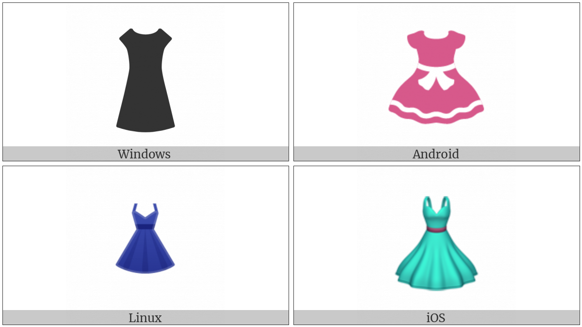 The image below shows how the “Dress” symbol might look like on different operating systems. If the font in which this web site is displayed does not contain the symbol and there is no fallback font able to render it, you can use the image below to get an idea of what it should look like.