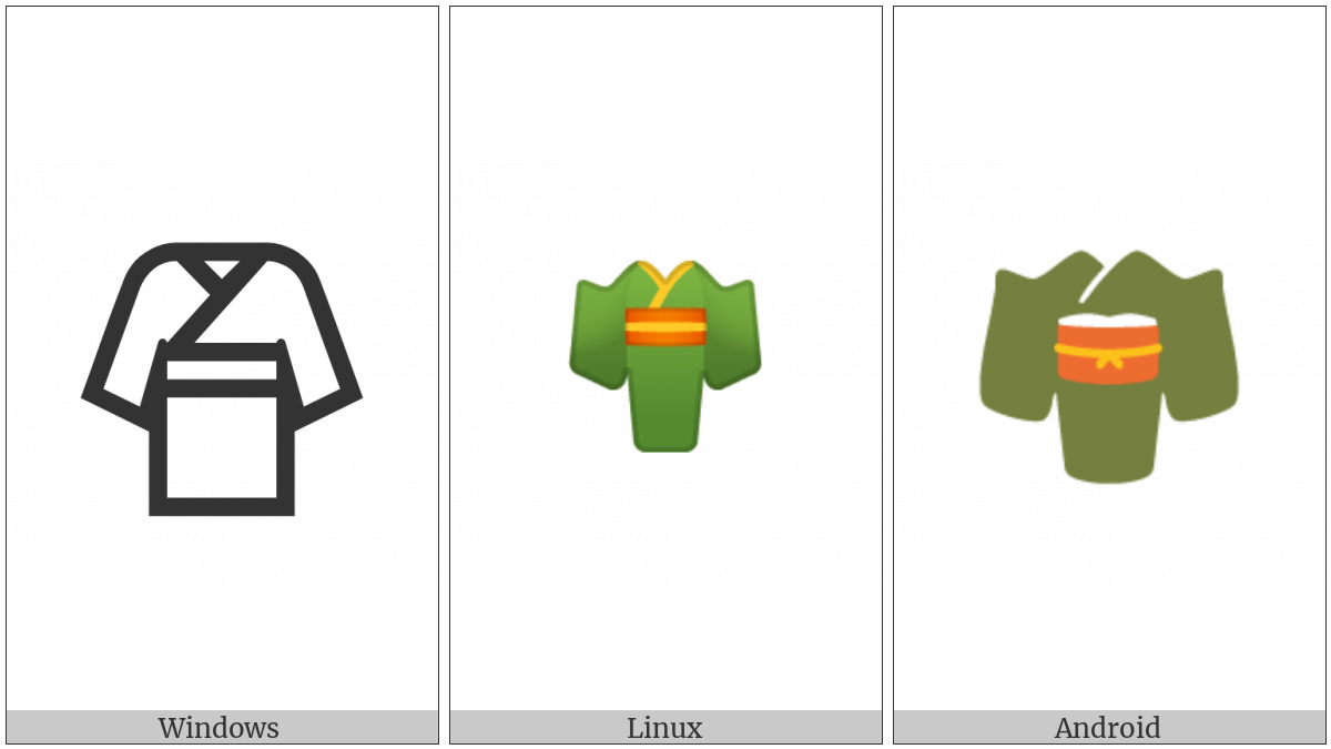 The image below shows how the “Kimono” symbol might look like on different operating systems. If the font in which this web site is displayed does not contain the symbol and there is no fallback font able to render it, you can use the image below to get an idea of what it should look like.