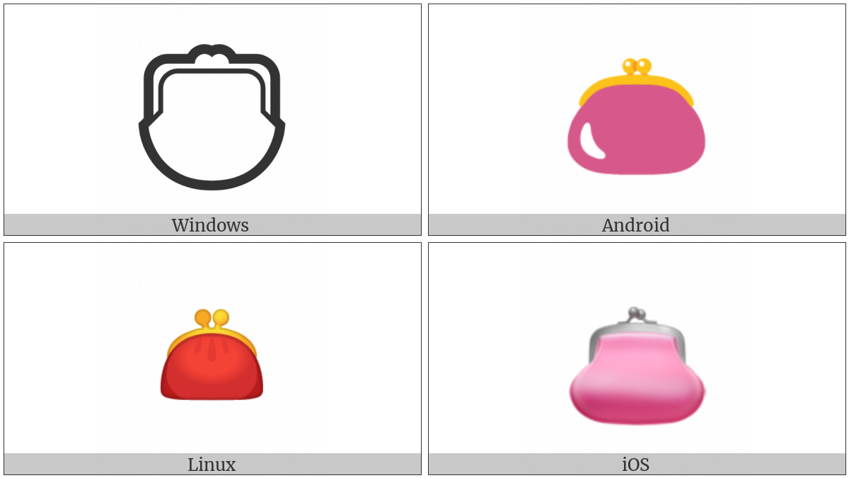 The image below shows how the “Purse” symbol might look like on different operating systems. If the font in which this web site is displayed does not contain the symbol and there is no fallback font able to render it, you can use the image below to get an idea of what it should look like.