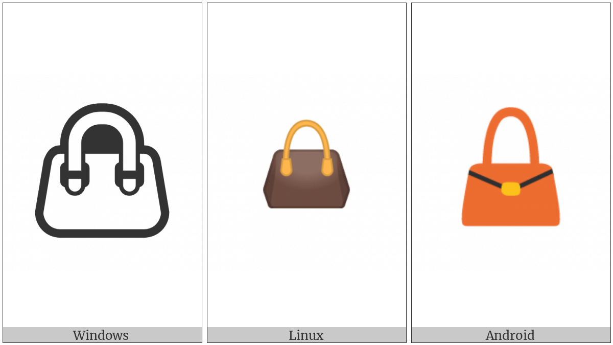 The image below shows how the “Handbag” symbol might look like on different operating systems. If the font in which this web site is displayed does not contain the symbol and there is no fallback font able to render it, you can use the image below to get an idea of what it should look like.