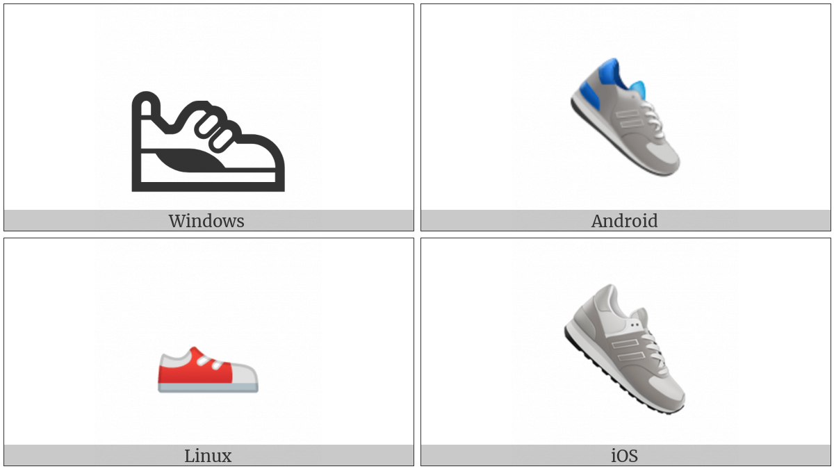 The image below shows how the “Athletic Shoe” symbol might look like on different operating systems. If the font in which this web site is displayed does not contain the symbol and there is no fallback font able to render it, you can use the image below to get an idea of what it should look like.