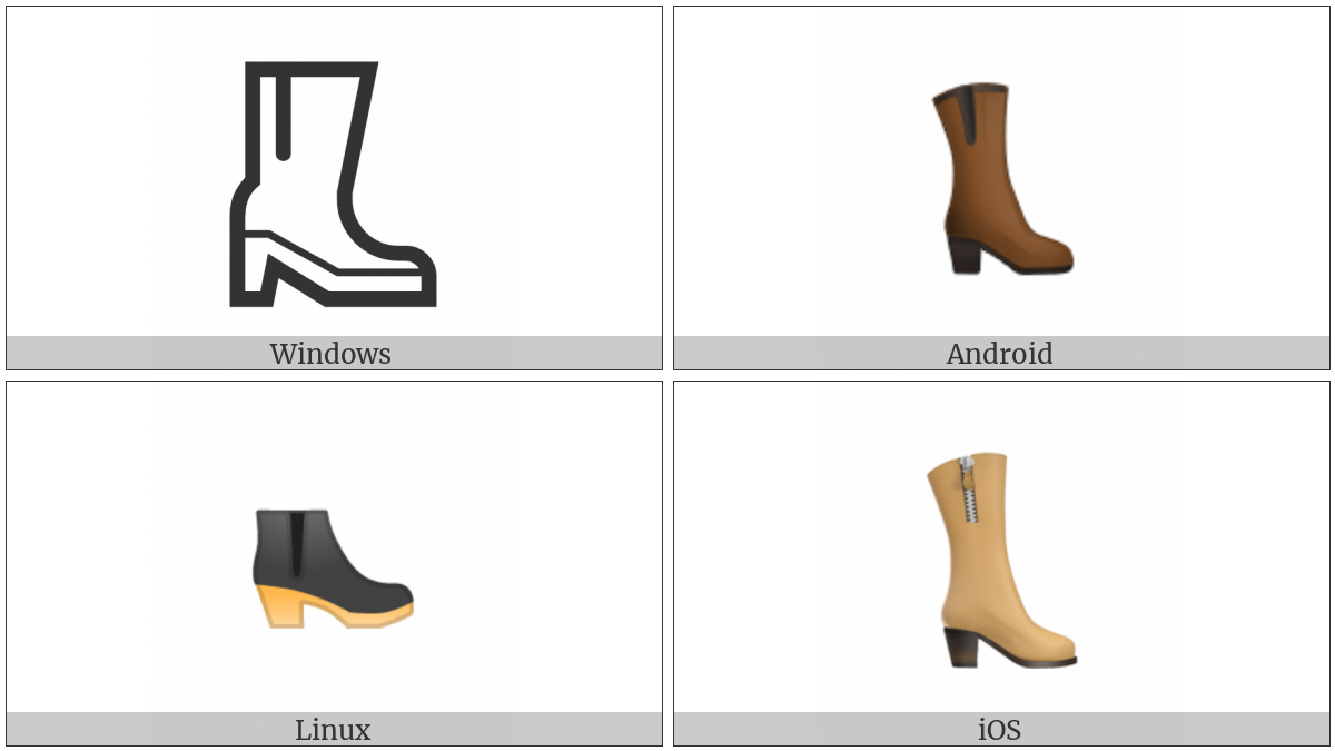 The image below shows how the “Womans Boots” symbol might look like on different operating systems. If the font in which this web site is displayed does not contain the symbol and there is no fallback font able to render it, you can use the image below to get an idea of what it should look like.