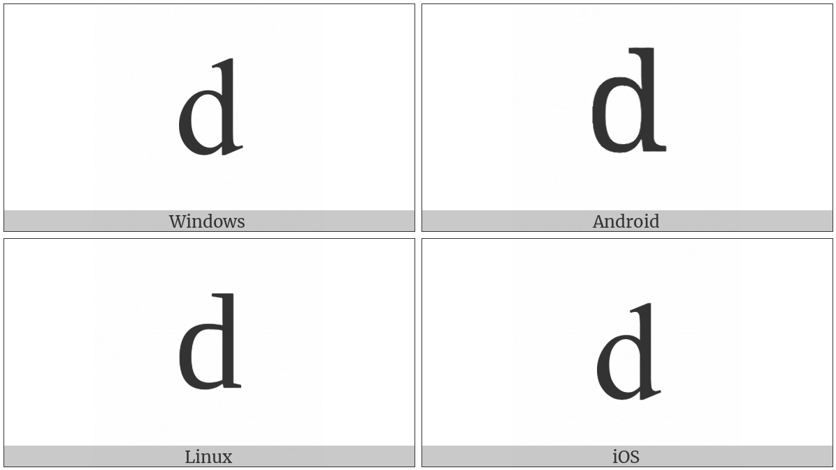 The image below shows how the “Cyrillic Small Letter Komi De” symbol might look like on different operating systems. If the font in which this web site is displayed does not contain the symbol and there is no fallback font able to render it, you can use the image below to get an idea of what it should look like.