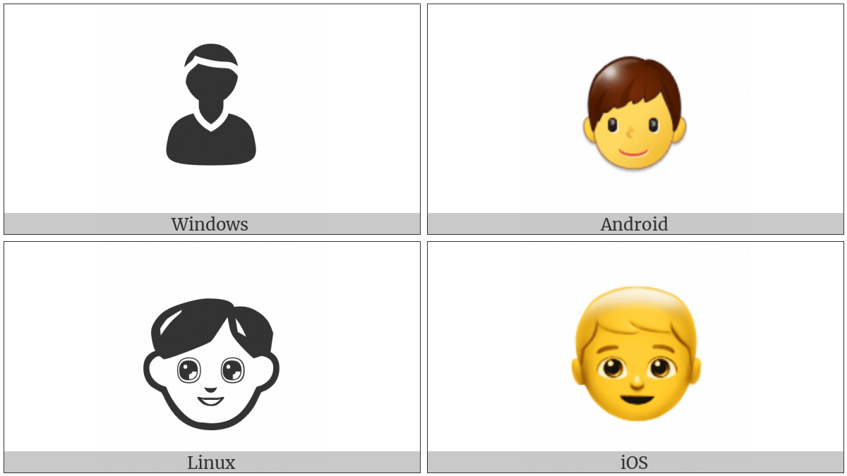 The image below shows how the “Boy” symbol might look like on different operating systems. If the font in which this web site is displayed does not contain the symbol and there is no fallback font able to render it, you can use the image below to get an idea of what it should look like.