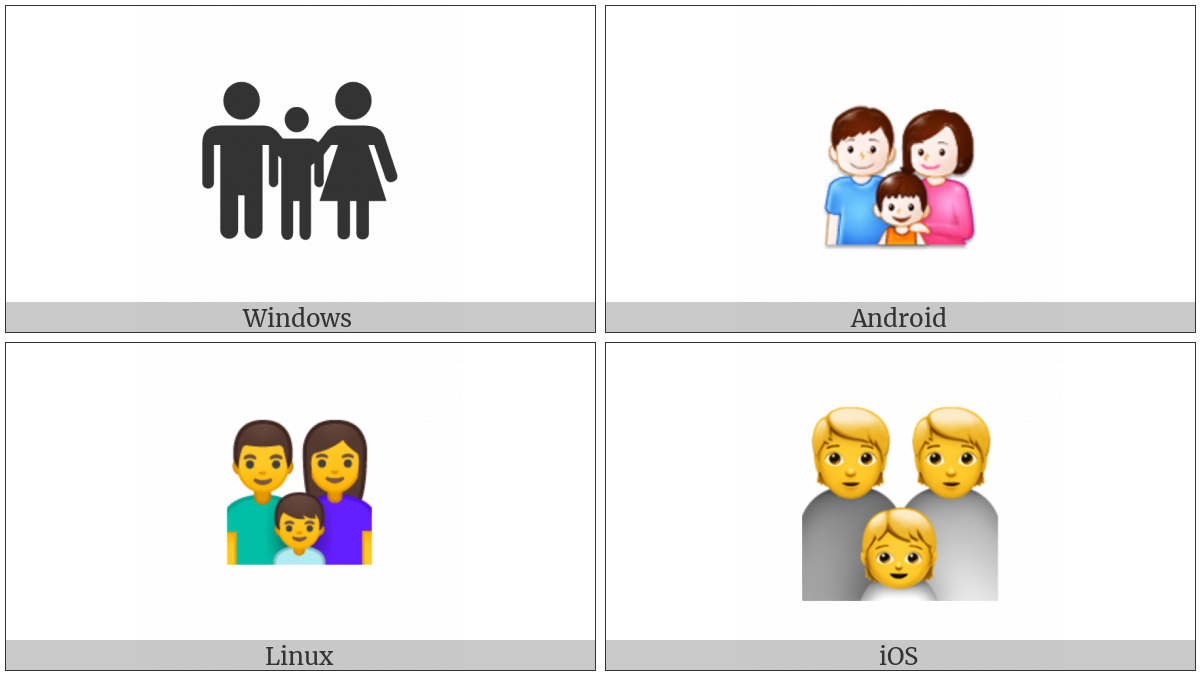 The image below shows how the “Family” symbol might look like on different operating systems. If the font in which this web site is displayed does not contain the symbol and there is no fallback font able to render it, you can use the image below to get an idea of what it should look like.