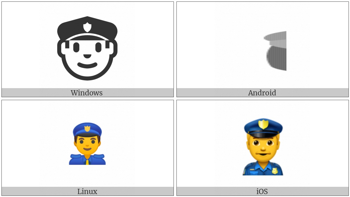 The image below shows how the “Police Officer” symbol might look like on different operating systems. If the font in which this web site is displayed does not contain the symbol and there is no fallback font able to render it, you can use the image below to get an idea of what it should look like.