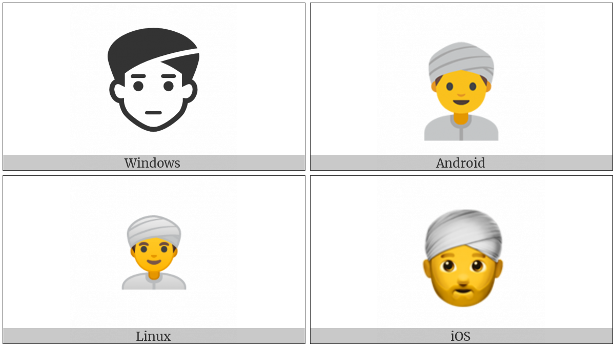 The image below shows how the “Man With Turban” symbol might look like on different operating systems. If the font in which this web site is displayed does not contain the symbol and there is no fallback font able to render it, you can use the image below to get an idea of what it should look like.