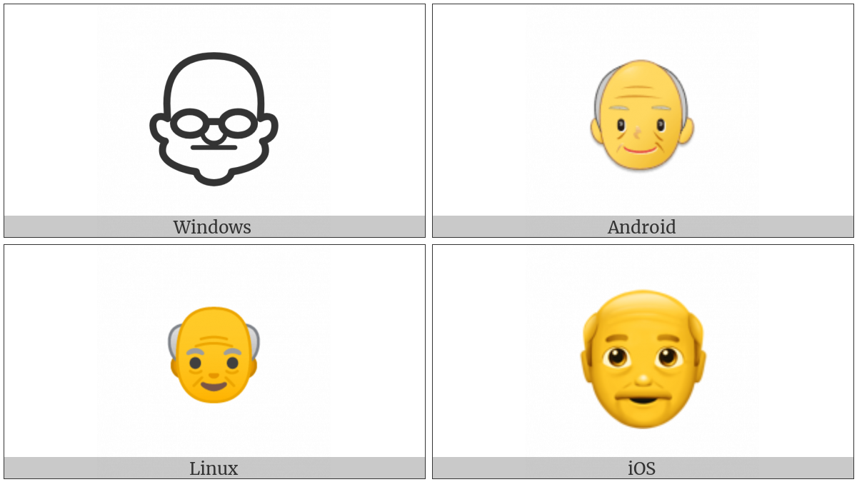 The image below shows how the “Older Man” symbol might look like on different operating systems. If the font in which this web site is displayed does not contain the symbol and there is no fallback font able to render it, you can use the image below to get an idea of what it should look like.