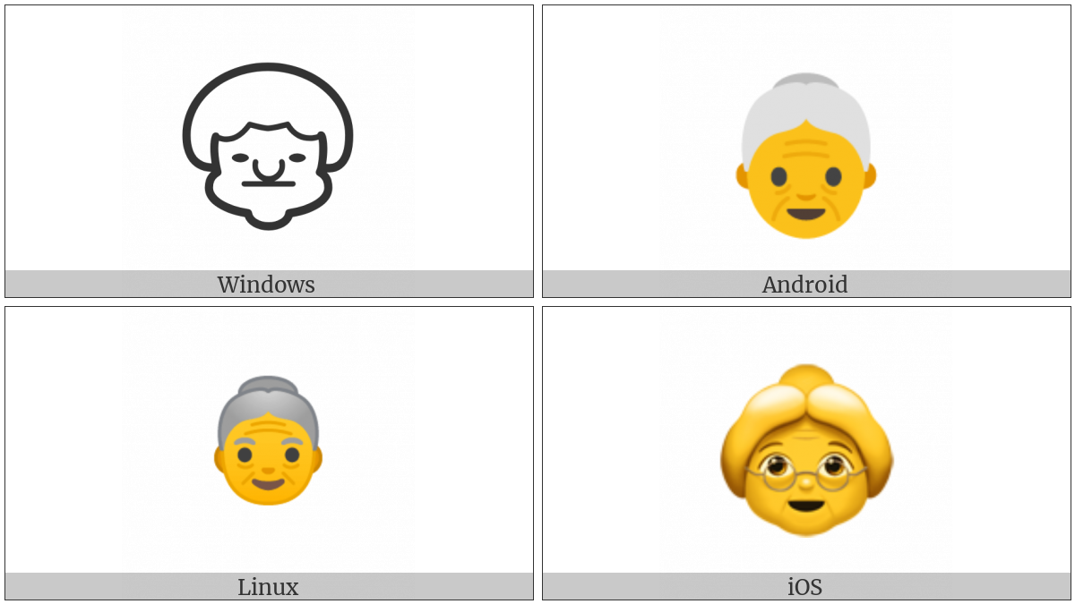 The image below shows how the “Older Woman” symbol might look like on different operating systems. If the font in which this web site is displayed does not contain the symbol and there is no fallback font able to render it, you can use the image below to get an idea of what it should look like.