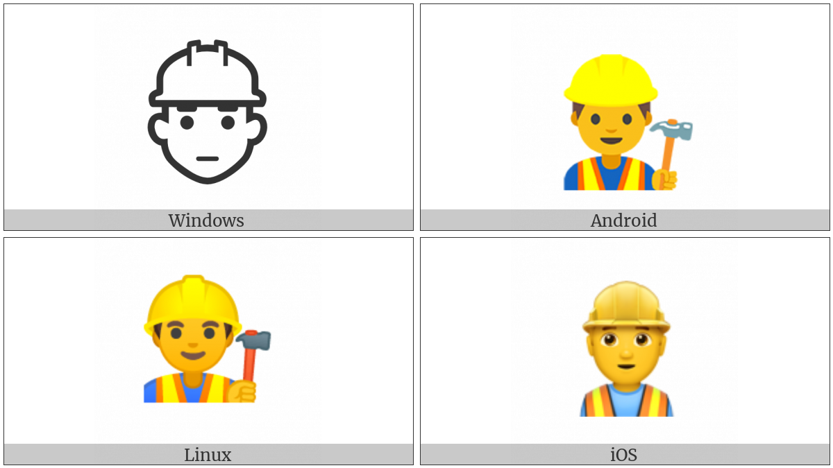 The image below shows how the “Construction Worker” symbol might look like on different operating systems. If the font in which this web site is displayed does not contain the symbol and there is no fallback font able to render it, you can use the image below to get an idea of what it should look like.