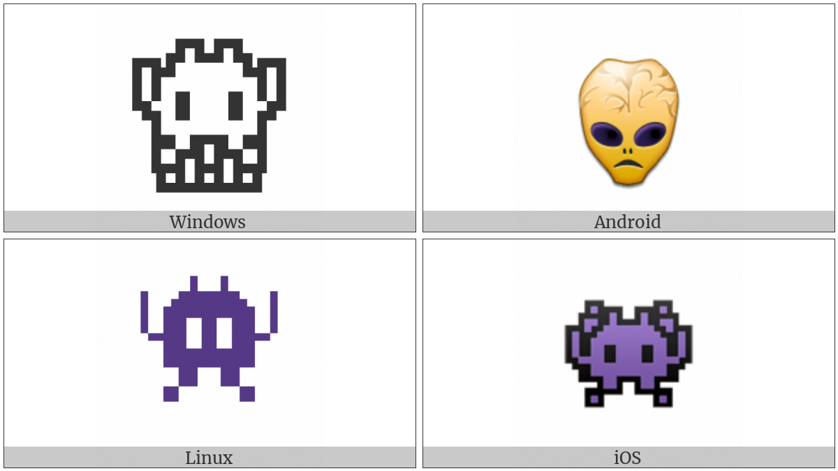 The image below shows how the “Alien Monster” symbol might look like on different operating systems. If the font in which this web site is displayed does not contain the symbol and there is no fallback font able to render it, you can use the image below to get an idea of what it should look like.