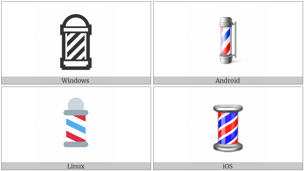 The image below shows how the “Barber Pole” symbol might look like on different operating systems. If the font in which this web site is displayed does not contain the symbol and there is no fallback font able to render it, you can use the image below to get an idea of what it should look like.