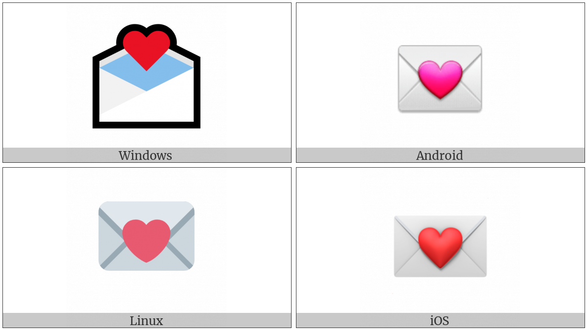 The image below shows how the “Love Letter” symbol might look like on different operating systems. If the font in which this web site is displayed does not contain the symbol and there is no fallback font able to render it, you can use the image below to get an idea of what it should look like.