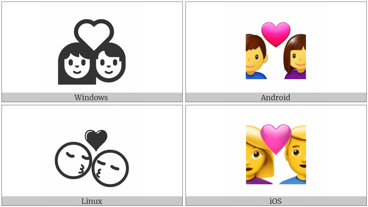 The image below shows how the “Couple With Heart” symbol might look like on different operating systems. If the font in which this web site is displayed does not contain the symbol and there is no fallback font able to render it, you can use the image below to get an idea of what it should look like.