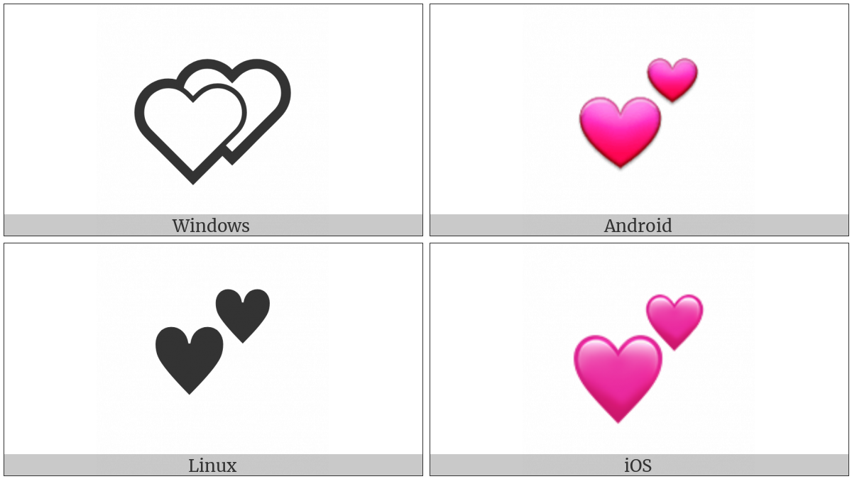 The image below shows how the “Two Hearts” symbol might look like on different operating systems. If the font in which this web site is displayed does not contain the symbol and there is no fallback font able to render it, you can use the image below to get an idea of what it should look like.