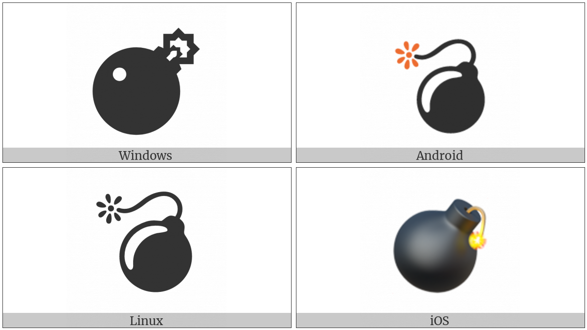 The image below shows how the “Bomb” symbol might look like on different operating systems. If the font in which this web site is displayed does not contain the symbol and there is no fallback font able to render it, you can use the image below to get an idea of what it should look like.