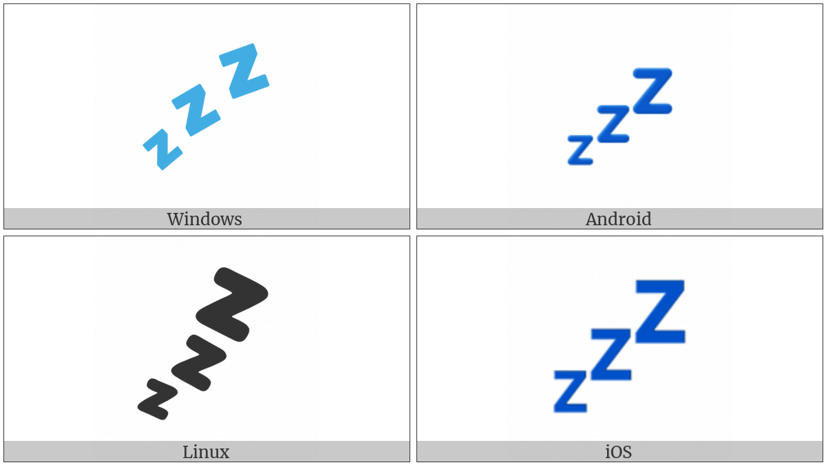The image below shows how the “Sleeping Symbol” symbol might look like on different operating systems. If the font in which this web site is displayed does not contain the symbol and there is no fallback font able to render it, you can use the image below to get an idea of what it should look like.