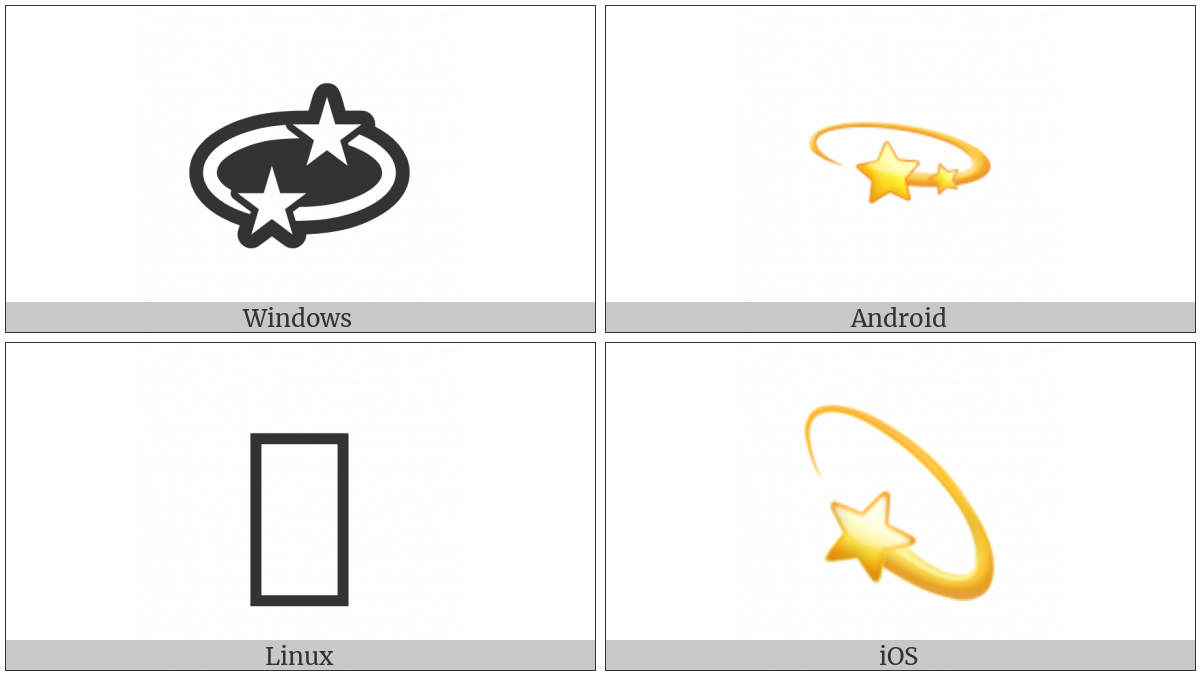 The image below shows how the “Dizzy Symbol” symbol might look like on different operating systems. If the font in which this web site is displayed does not contain the symbol and there is no fallback font able to render it, you can use the image below to get an idea of what it should look like.