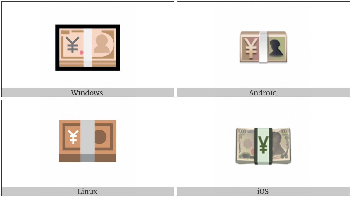 The image below shows how the “Banknote With Yen Sign” symbol might look like on different operating systems. If the font in which this web site is displayed does not contain the symbol and there is no fallback font able to render it, you can use the image below to get an idea of what it should look like.