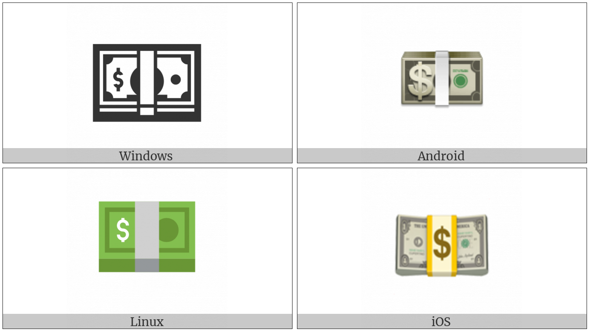 The image below shows how the “Banknote With Dollar Sign” symbol might look like on different operating systems. If the font in which this web site is displayed does not contain the symbol and there is no fallback font able to render it, you can use the image below to get an idea of what it should look like.