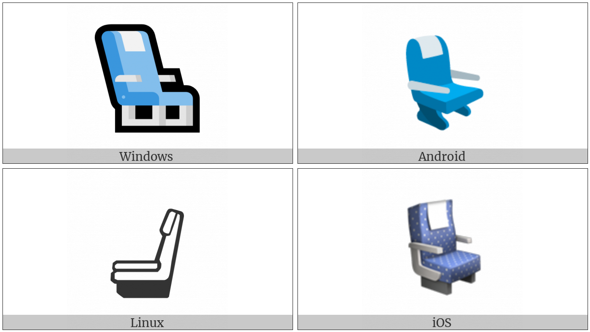 The image below shows how the “Seat” symbol might look like on different operating systems. If the font in which this web site is displayed does not contain the symbol and there is no fallback font able to render it, you can use the image below to get an idea of what it should look like.