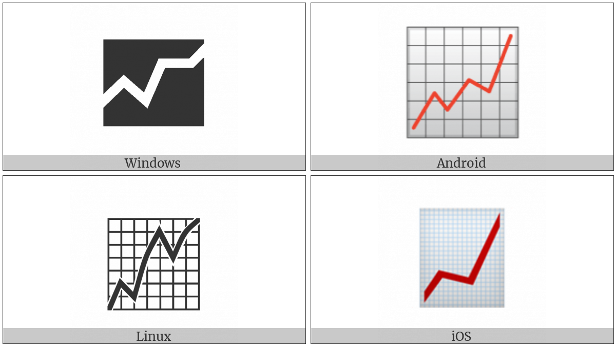 The image below shows how the “Chart With Upwards Trend” symbol might look like on different operating systems. If the font in which this web site is displayed does not contain the symbol and there is no fallback font able to render it, you can use the image below to get an idea of what it should look like.