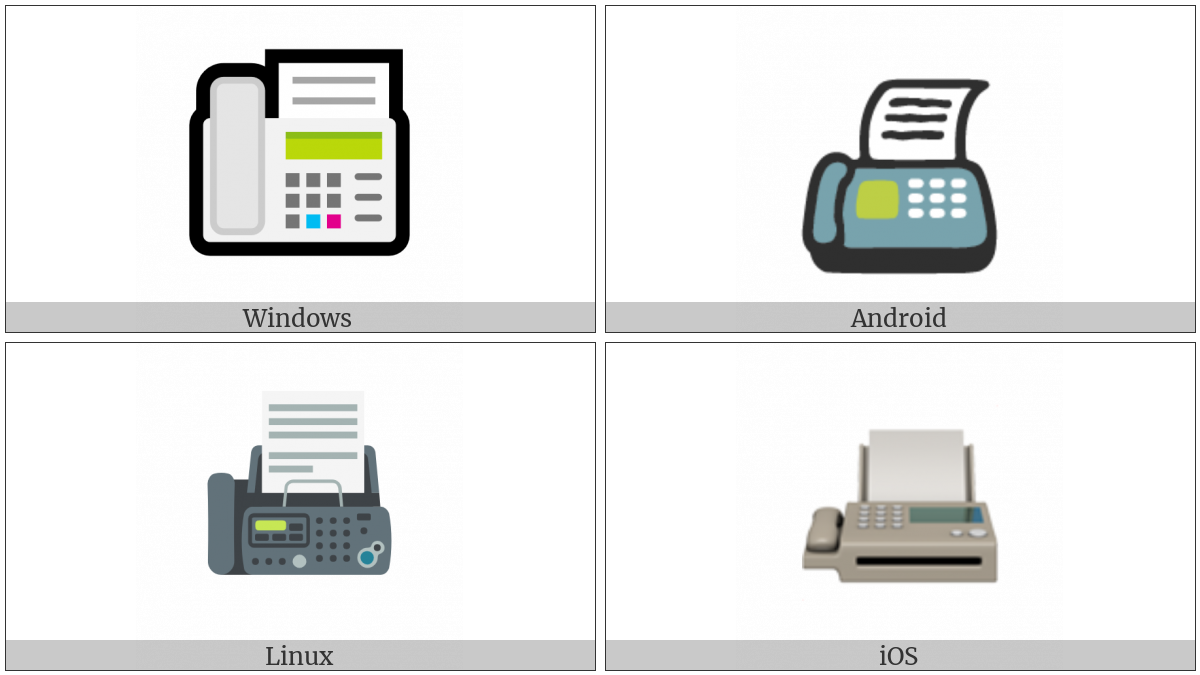 The image below shows how the “Fax Machine” symbol might look like on different operating systems. If the font in which this web site is displayed does not contain the symbol and there is no fallback font able to render it, you can use the image below to get an idea of what it should look like.