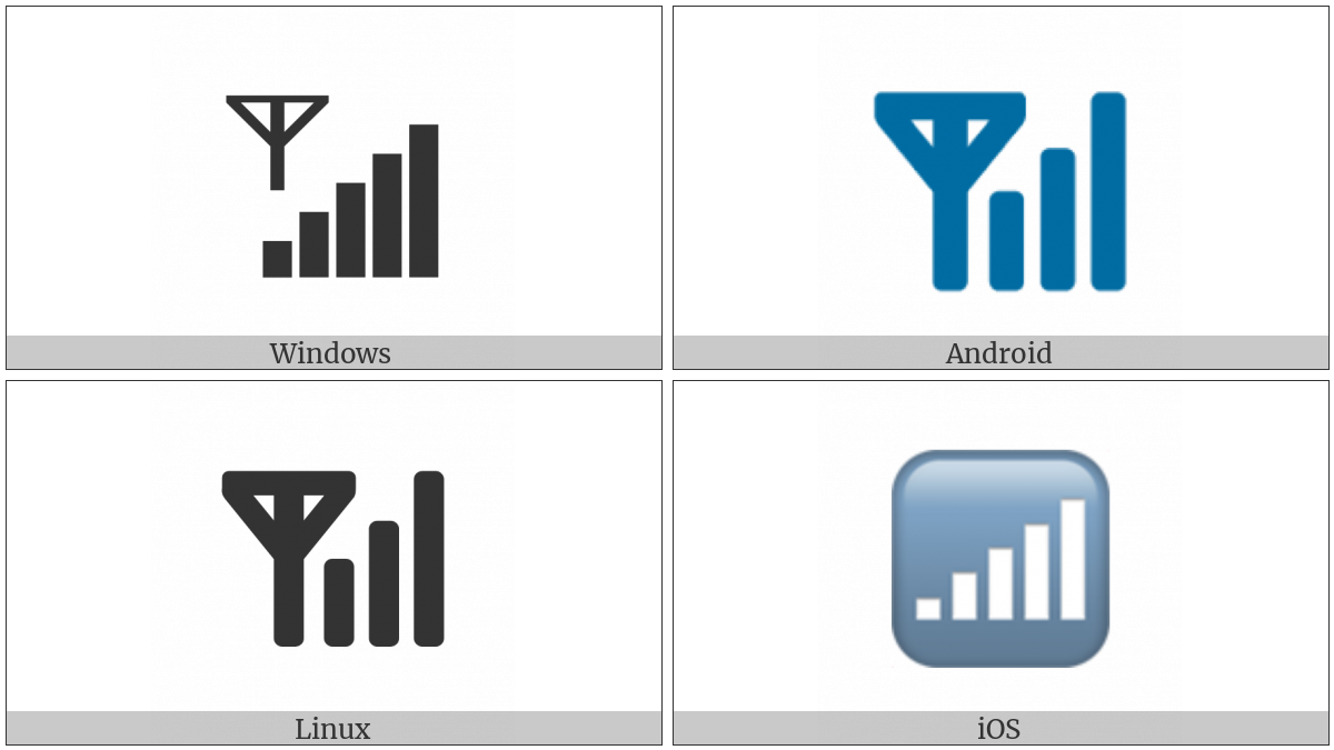 The image below shows how the “Antenna With Bars” symbol might look like on different operating systems. If the font in which this web site is displayed does not contain the symbol and there is no fallback font able to render it, you can use the image below to get an idea of what it should look like.