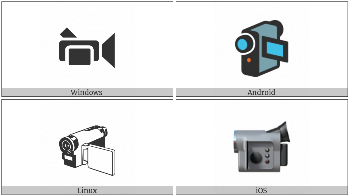 The image below shows how the “Video Camera” symbol might look like on different operating systems. If the font in which this web site is displayed does not contain the symbol and there is no fallback font able to render it, you can use the image below to get an idea of what it should look like.