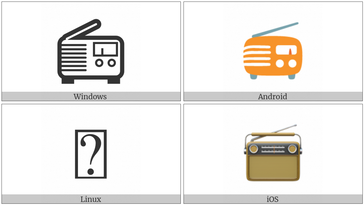 The image below shows how the “Radio” symbol might look like on different operating systems. If the font in which this web site is displayed does not contain the symbol and there is no fallback font able to render it, you can use the image below to get an idea of what it should look like.