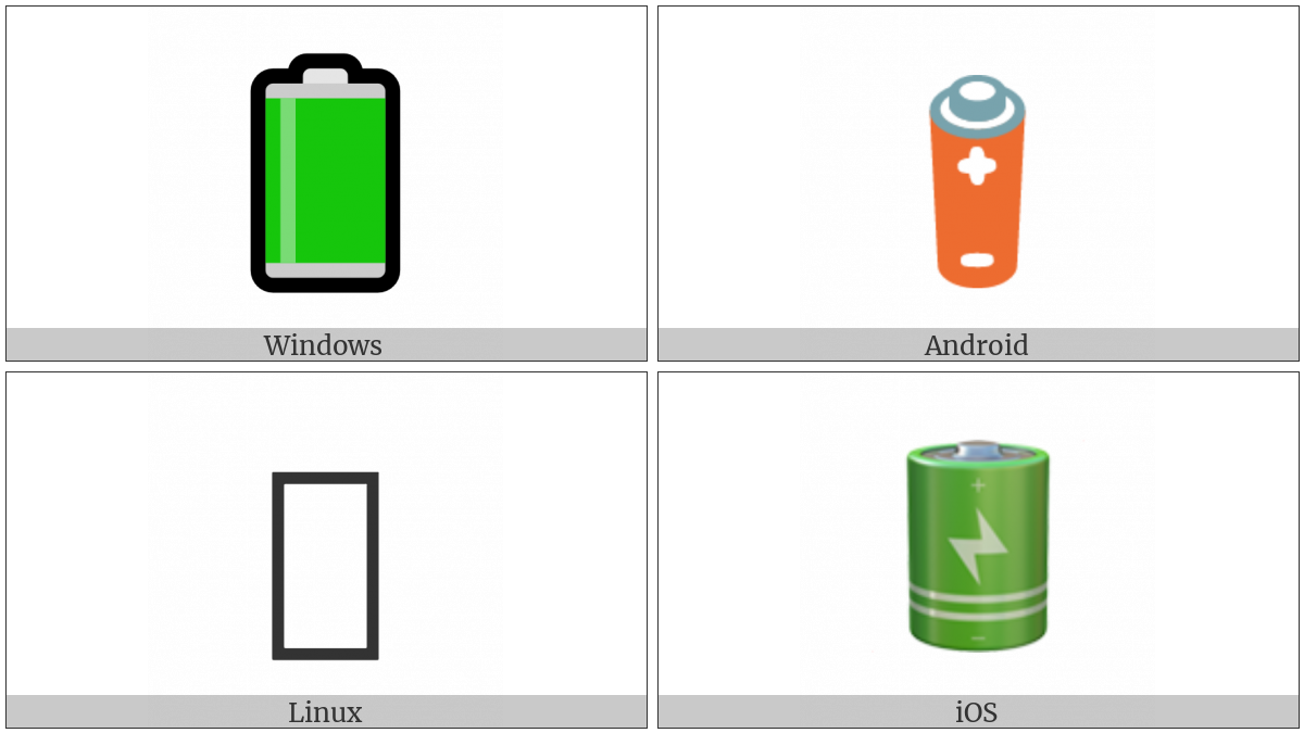 The image below shows how the “Battery” symbol might look like on different operating systems. If the font in which this web site is displayed does not contain the symbol and there is no fallback font able to render it, you can use the image below to get an idea of what it should look like.