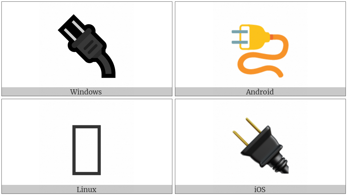 The image below shows how the “Electric Plug” symbol might look like on different operating systems. If the font in which this web site is displayed does not contain the symbol and there is no fallback font able to render it, you can use the image below to get an idea of what it should look like.
