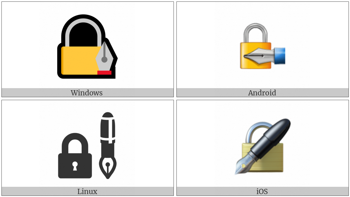 The image below shows how the “Lock With Ink Pen” symbol might look like on different operating systems. If the font in which this web site is displayed does not contain the symbol and there is no fallback font able to render it, you can use the image below to get an idea of what it should look like.