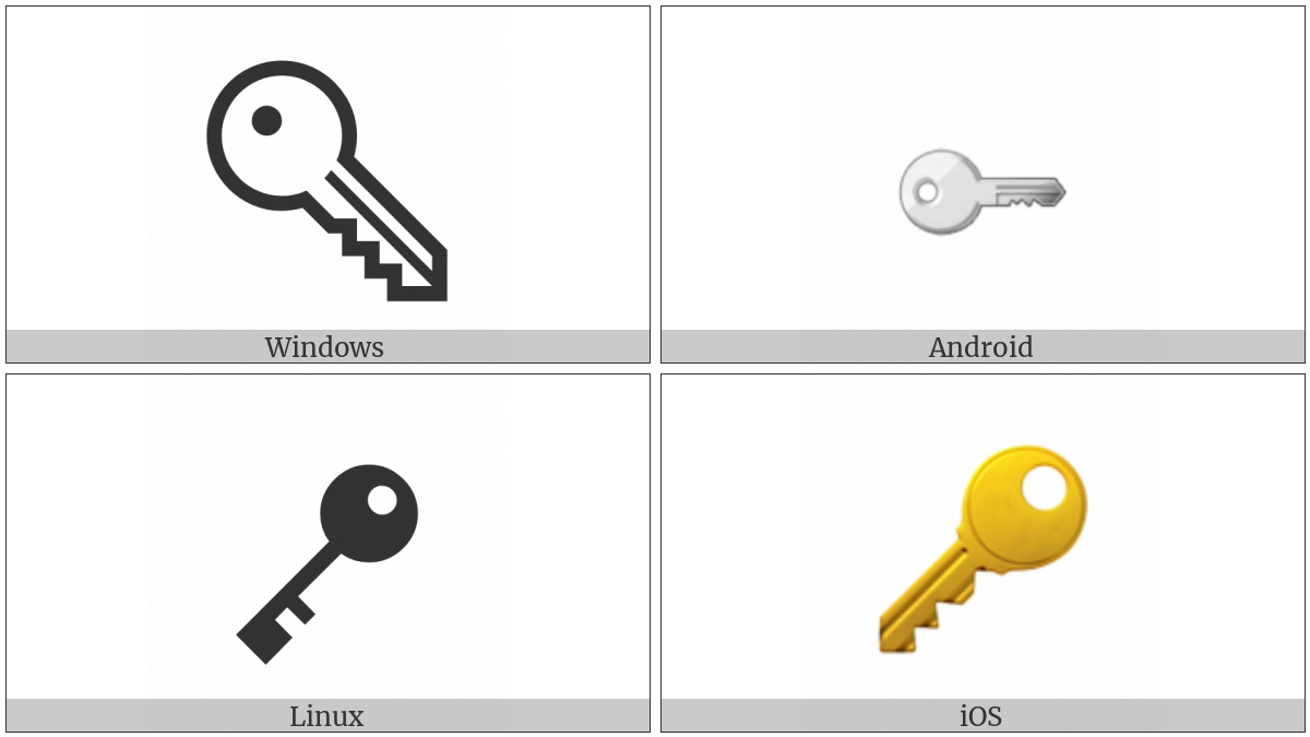 The image below shows how the “Key” symbol might look like on different operating systems. If the font in which this web site is displayed does not contain the symbol and there is no fallback font able to render it, you can use the image below to get an idea of what it should look like.