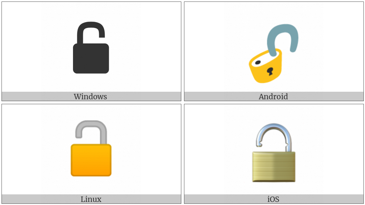 The image below shows how the “Open Lock” symbol might look like on different operating systems. If the font in which this web site is displayed does not contain the symbol and there is no fallback font able to render it, you can use the image below to get an idea of what it should look like.